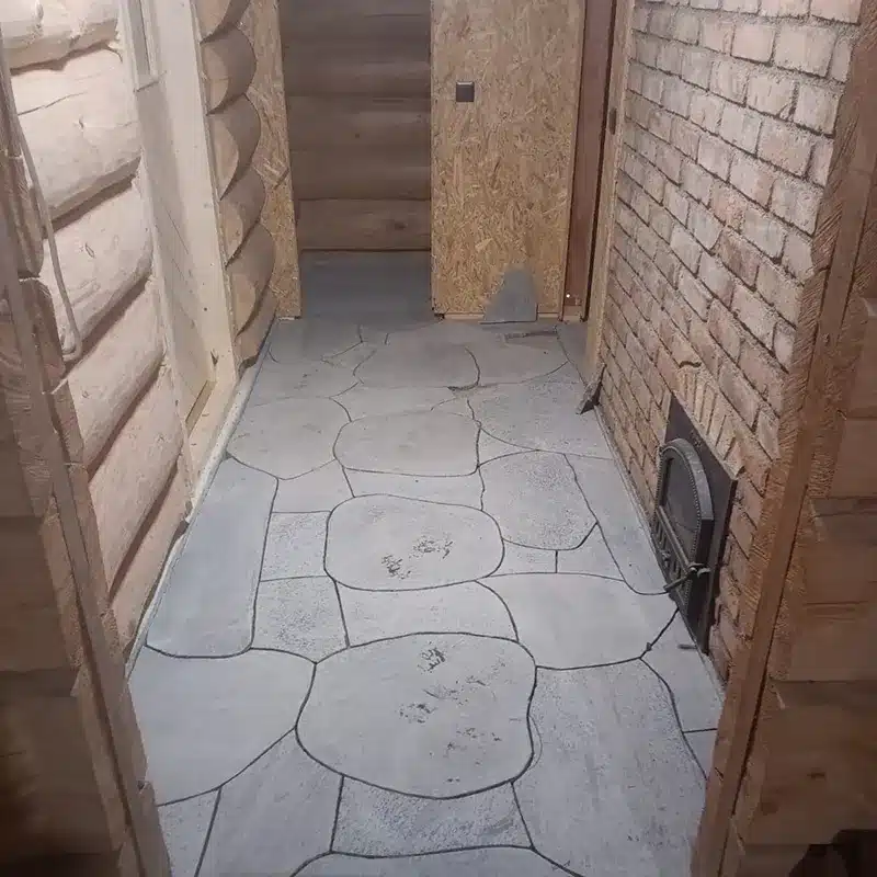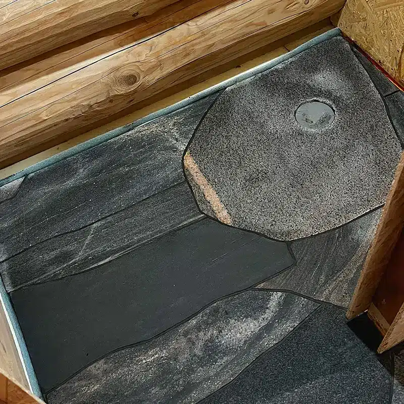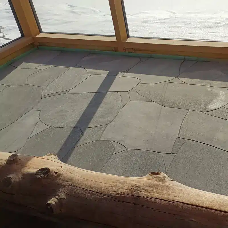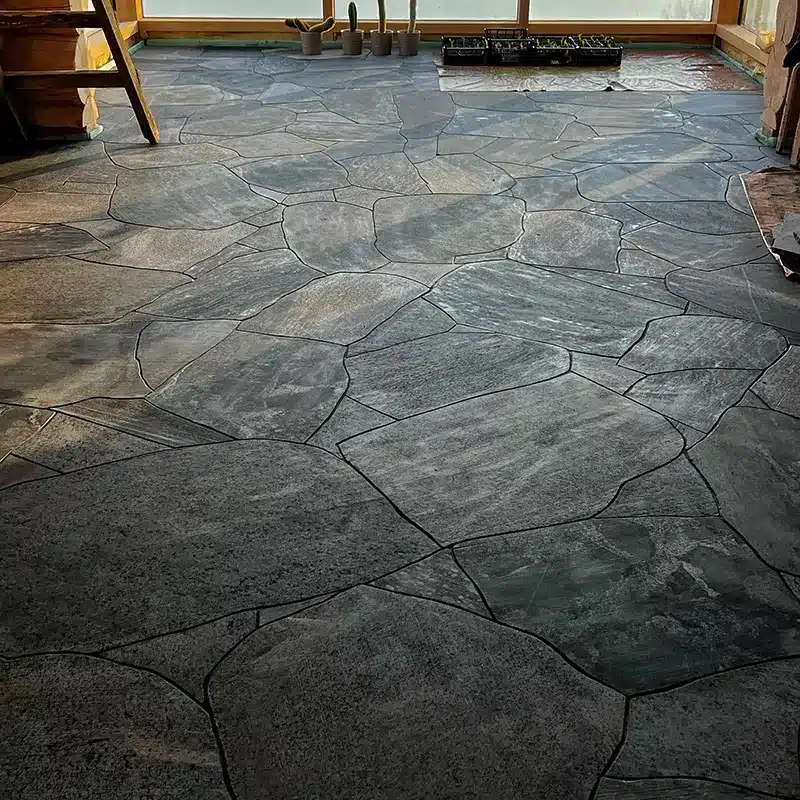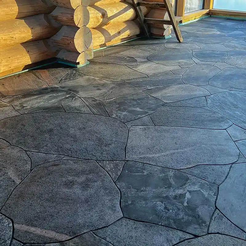 Akmens flīžu grīda ir veidota no dabīgā laukakmens flīzēm, kas sakārtotas neregulāros, mozaīkas veida rakstos. Šāda veida segums izceļas ar savu izturību, autentiskumu un dabisko skaistumu. Katrs laukakmens ir unikāls, ar atšķirīgu krāsu toni un faktūru — vienā akmens flīzē var būt vairāki toņi, kas kopā veido harmonisku un estētisku dizainu.
