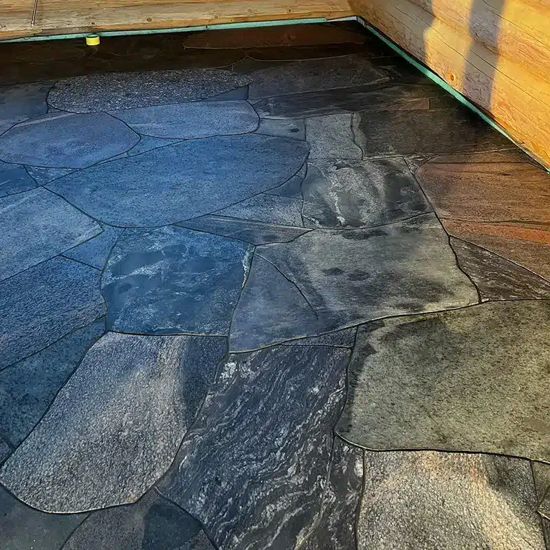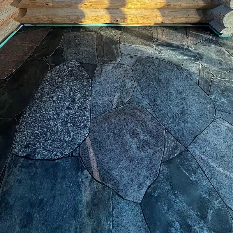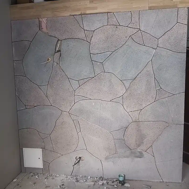 Neregulāras formas akmeņi, kas veidoti mozaīkas stilā un savienoti ar šuvēm, kas piešķir virsmai dabīgu un mākslinieciski brīvu izskatu.